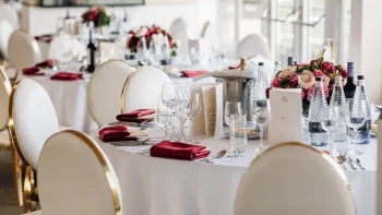 - Three-course luncheon. Starter and main course served at table. Buffet style desserts and cheese